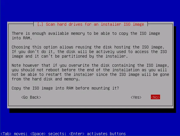 After selecting the ISO, choose Yes to load it into RAM. That lets us install to the very same disk afterwards.